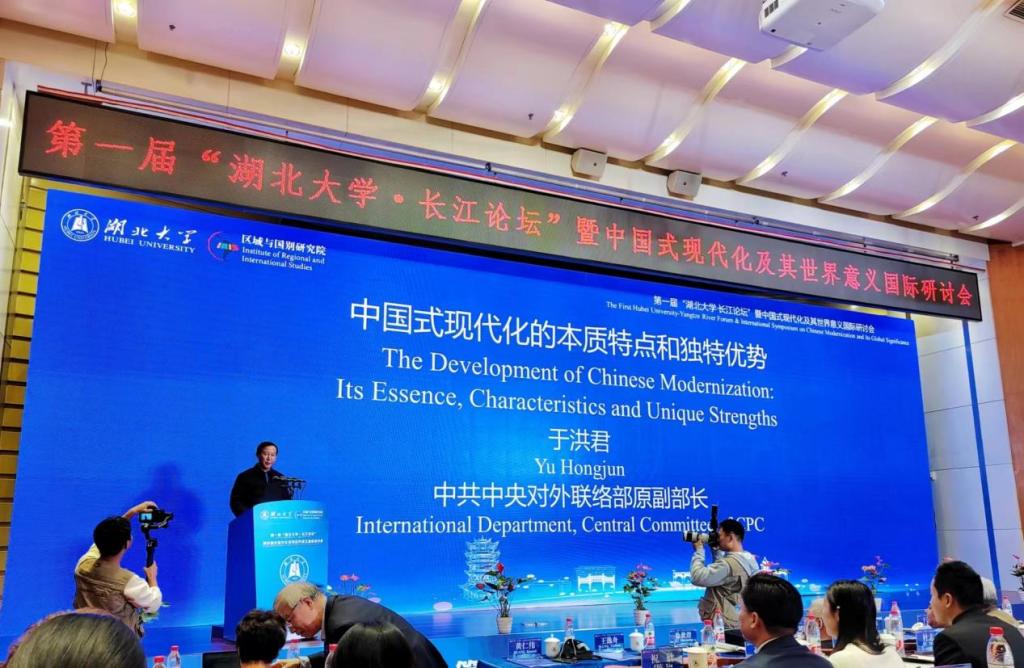 此次论坛下设“中国式现代化的内涵”“中国式现代化与全球治理”“中国式现代化的世界意义与比较研究”三个单元,以及“中国式现代化与长江文化”“中国法律现代化及其世界意义”两个分论坛。中共中央对外联络部原副部长于洪君,中国外交部拉丁美洲和加勒比司司长蔡伟,湖北省人民政府副秘书长何丽君,湖北省人民政府外事办公室主任章笑梅,中国社会科学院拉丁美洲研究所荣誉学部委员徐世澄研究员,中国人民大学国际关系学院金灿荣教授,中央党校国际战略研究院副院长吴志成教授,南京大学区域国别研究院王逸舟教授等专家学者出席会议并发言。我校校长刘建平教授代表学校致辞,校党委副书记祝欣主持会议开幕式。williamhill威廉希尔官网贺祥林教授、副院长易振龙教授,以及龚梦、胡银银、王敏、陈晨、王勇、沈钰晶、冷自衍等年轻老师参会。博士研究生刘秋岑、田敬参加会议并在分论坛作学术发言。