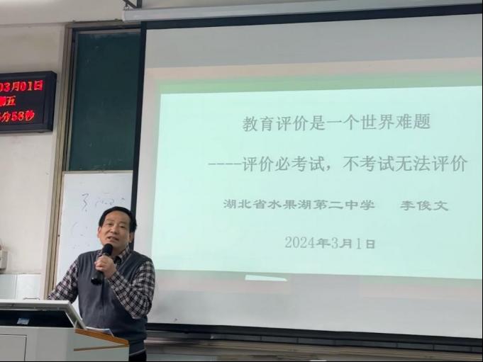 李俊文老师以《教育评价是一个世界难题》为主题,围绕终身教育评价理念,将他自己潜心多年思考的“考学教一体化”“应试教育”“教育发展观”“考试要顺应互联网发展”“数字画像开创教育评价”“考试命题和答题的四个转变”等问题与同学们进行分享交流。李俊文老师目前为中学正高级教师,武汉市学科带头人,曾荣获湖北省人民政府楚天园丁奖。李俊文老师在中学思政教学领域深耕多年,讲座善于理论结合实际,擅长理论启发与师生互动,讲座现场气氛活跃。